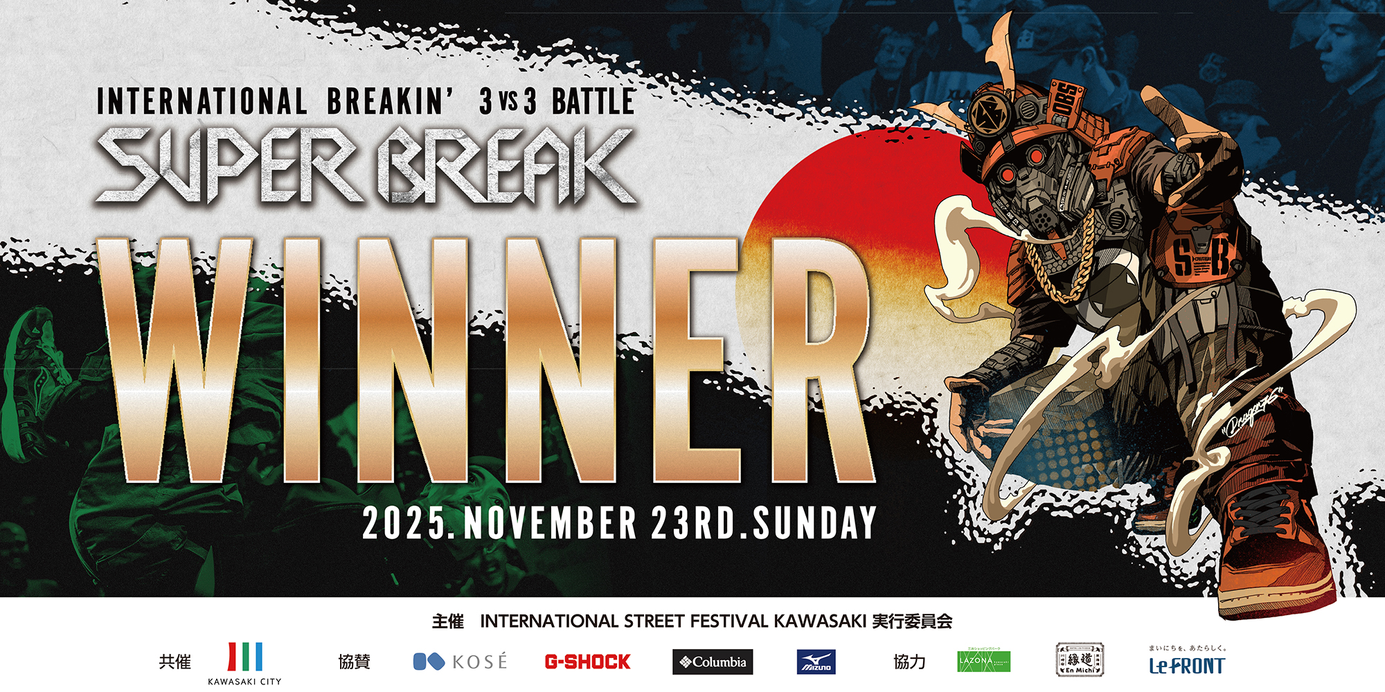 世界大会「SUPER BREAK 2025」のキービジュアルおよび関連制作物(キャスト画像・サイドバナー・ウィナーボード)のデザインを担当しました。
